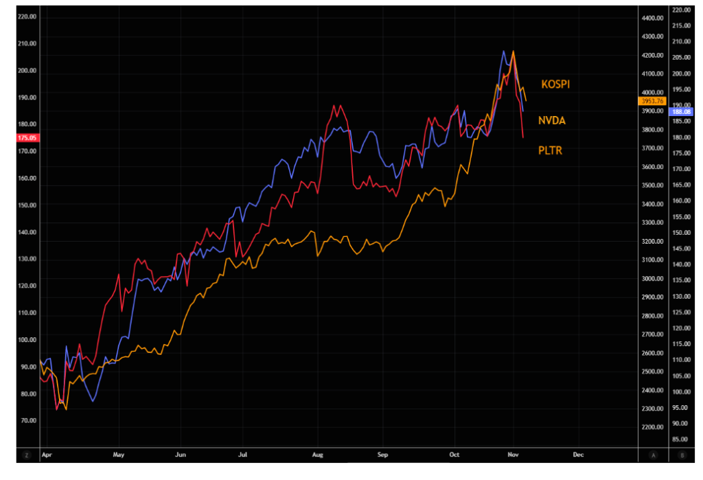 KOSPI指数与英伟达(NVDA)和Palantir(PLTR)等美股AI概念股走势高度一致,表明全球AI投资已形成高度关联的单一交易主题。