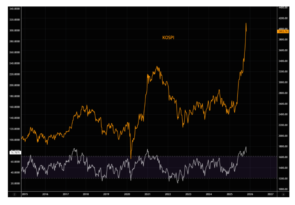 KOSPI指数的技术指标显示出明显的过热信号。周线和月线相对强弱指数(RSI)水平已达到极端区域,显示市场严重超买。