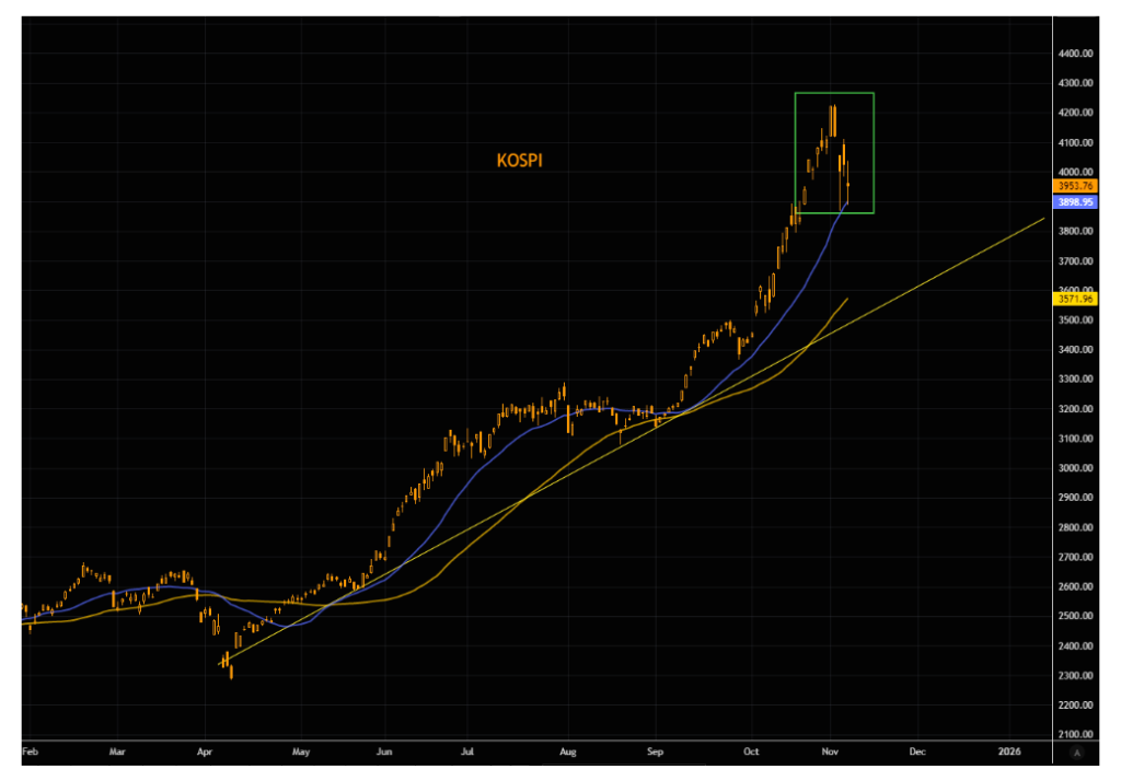 “在我们的泡沫分析框架下,KOSPI是波动幅度最大的市场之一。这并不一定意味着市场即将反转,但这无疑是一个额外的警示信号,表明市场波动异常剧烈且迅速。”