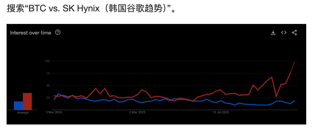 Upbit交易所数据显示,韩国加密货币交易量大幅萎缩,而SK海力士与比特币的走势在9月开始明显分化。谷歌趋势数据显示,韩国用户对SK海力士的搜索热度已超越比特币,反映出投资者兴趣的根本性转移。韩国投资者开始集中追逐AI投资机会,将此前投入加密货币的资金重新配置到半导体和AI相关股票。